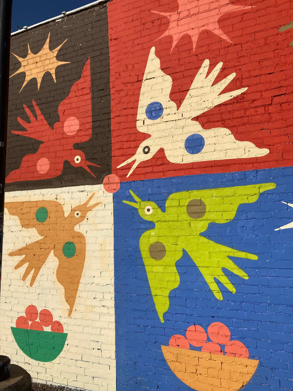 A mural completed in the Plaza District of Oklahoma City for their annual Plaza Fest. Painted on the side of a local brewery, measuring about 400 square feet. Inspired by flight patterns of the Oklahoma Starlings.